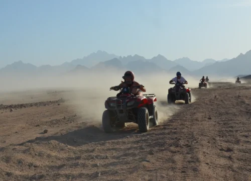Your afternoon begins with a comfortable, air-conditioned hotel pickup, followed by a transfer to the safari base for your quad-biking adventure. After a short briefing and test drive, embark on a 25 km ride across golden dunes, framed by the dramatic Red Sea Mountains. The journey lasts about an hour, giving you ample time to enjoy the freedom and excitement of the vast desert landscape.
